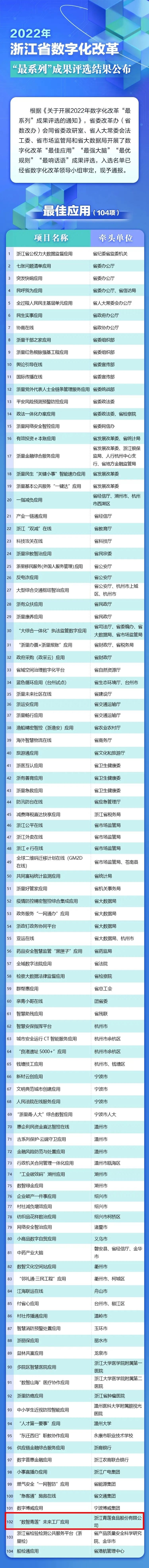10月29日,省委改革辦(省數(shù)改辦)公布2022年數(shù)字化改革“最系列”成果。其中,浙江青蓮食品股份有限公司“數(shù)智青蓮”未來工廠獲得“最佳應(yīng)用”殊榮,也是全省入選者中唯一一家未來工廠!